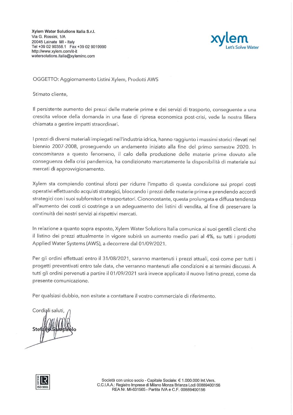 Lettera commerciale aumento prezzi